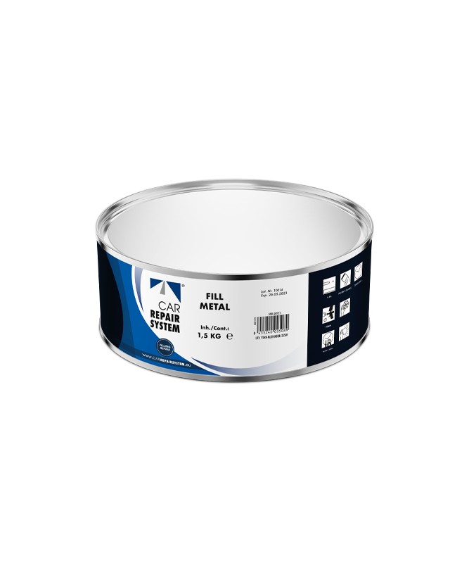 La masilla Fill Metal de Car Repair System es una masilla de poliéster con carga metálica, especialmente formulada para trabajos exigentes de reparación de carrocería. Su composición reforzada proporciona una gran resistencia mecánica, excelente adherencia sobre acero, aluminio y superficies galvanizadas, y una alta estabilidad en zonas sometidas a vibraciones o esfuerzos.